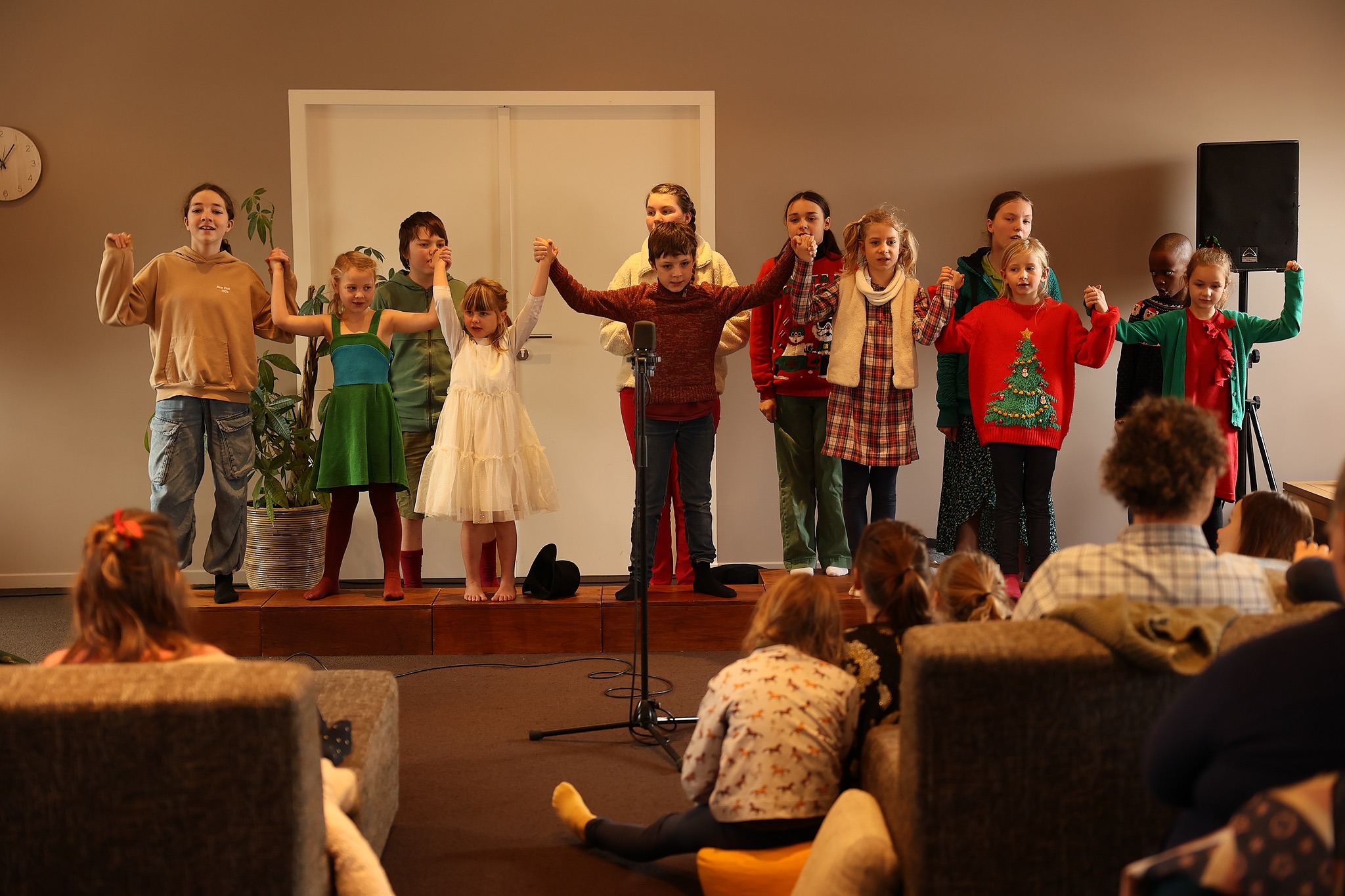 Kinderkoor VIVO! zong op 23 december over vrede, samenzijn en kerstgezelligheid. In enkele op maat geschreven liederen drukten de kinderen hun wensen uit voor het publiek. Sterretjes die zingen dat iemand van je houdt, een heuse kerstdetective die iets verdachts met de kerstcadeautjes opspoort... Ook was er ruimte voor medeleven ver en dichtbij, naar mensen toe die geen huis hebben, of niet terecht kunnen bij vrienden of familie... Het was een warme, verbindende voormiddag op een volle Poorthuis-zolder!